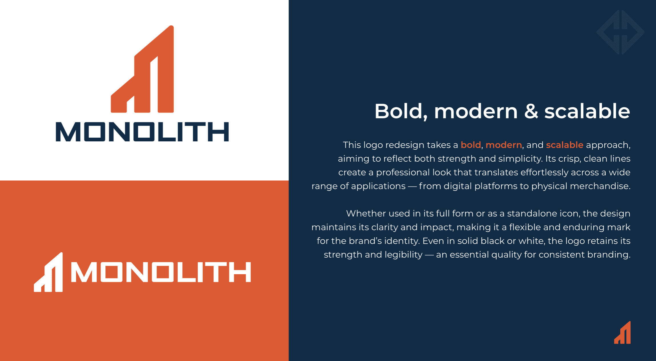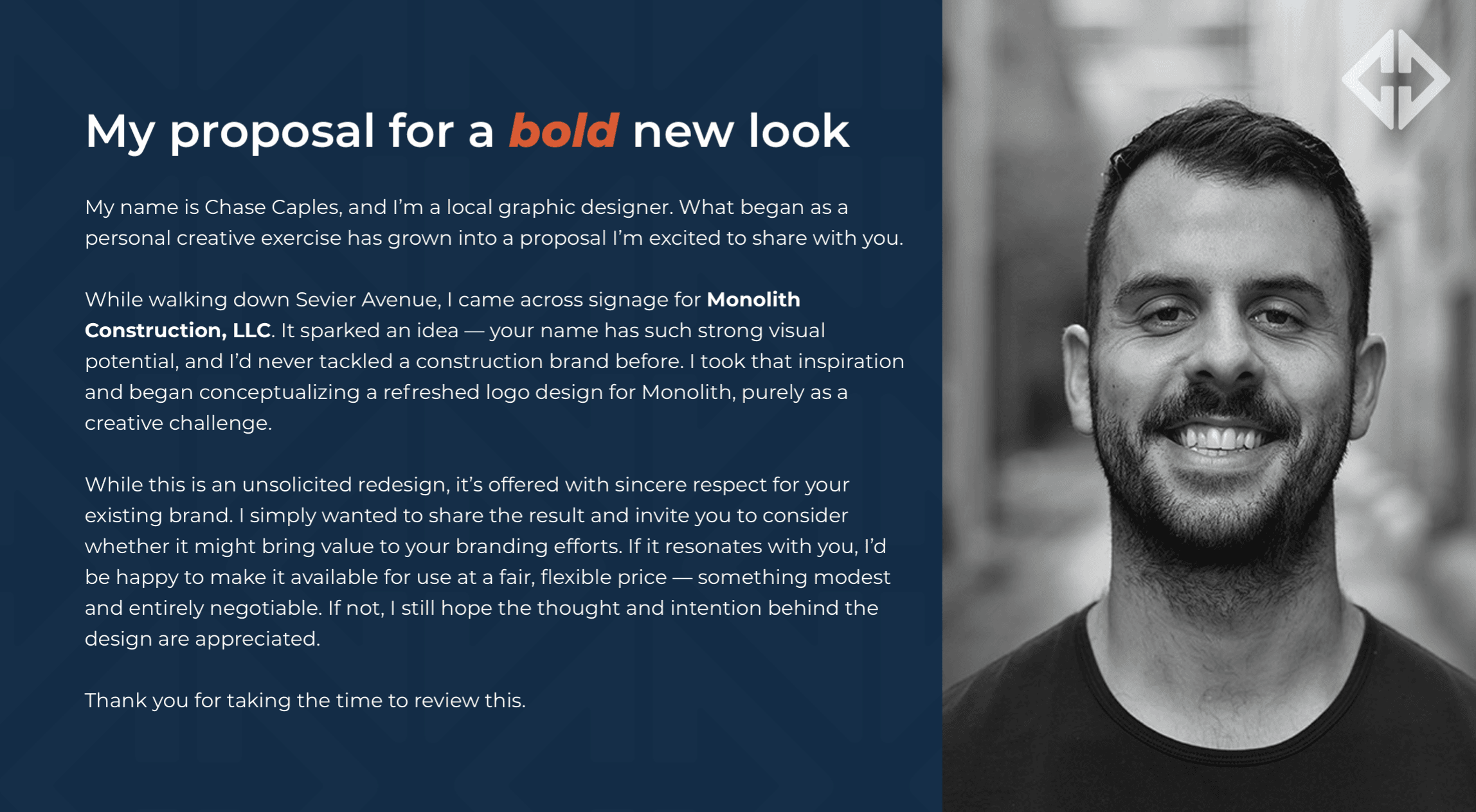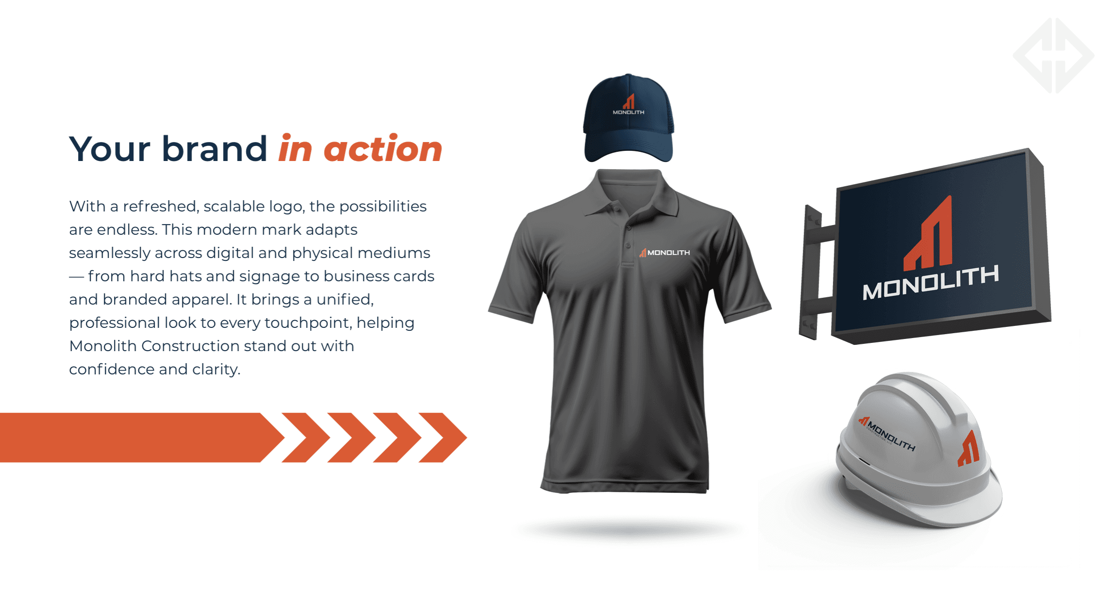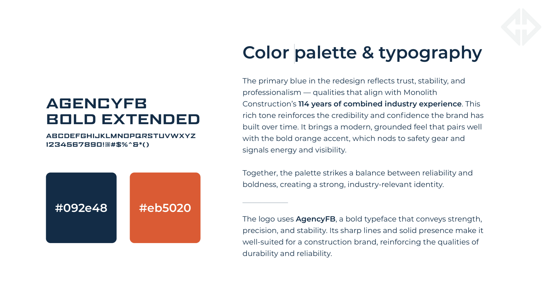 The accompanying slide deck represents the actual proposal I sent to Monolith Construction Co., showcasing the complete brand system and demonstrating how strategic design choices can elevate a local business's visual presence and market positioning.