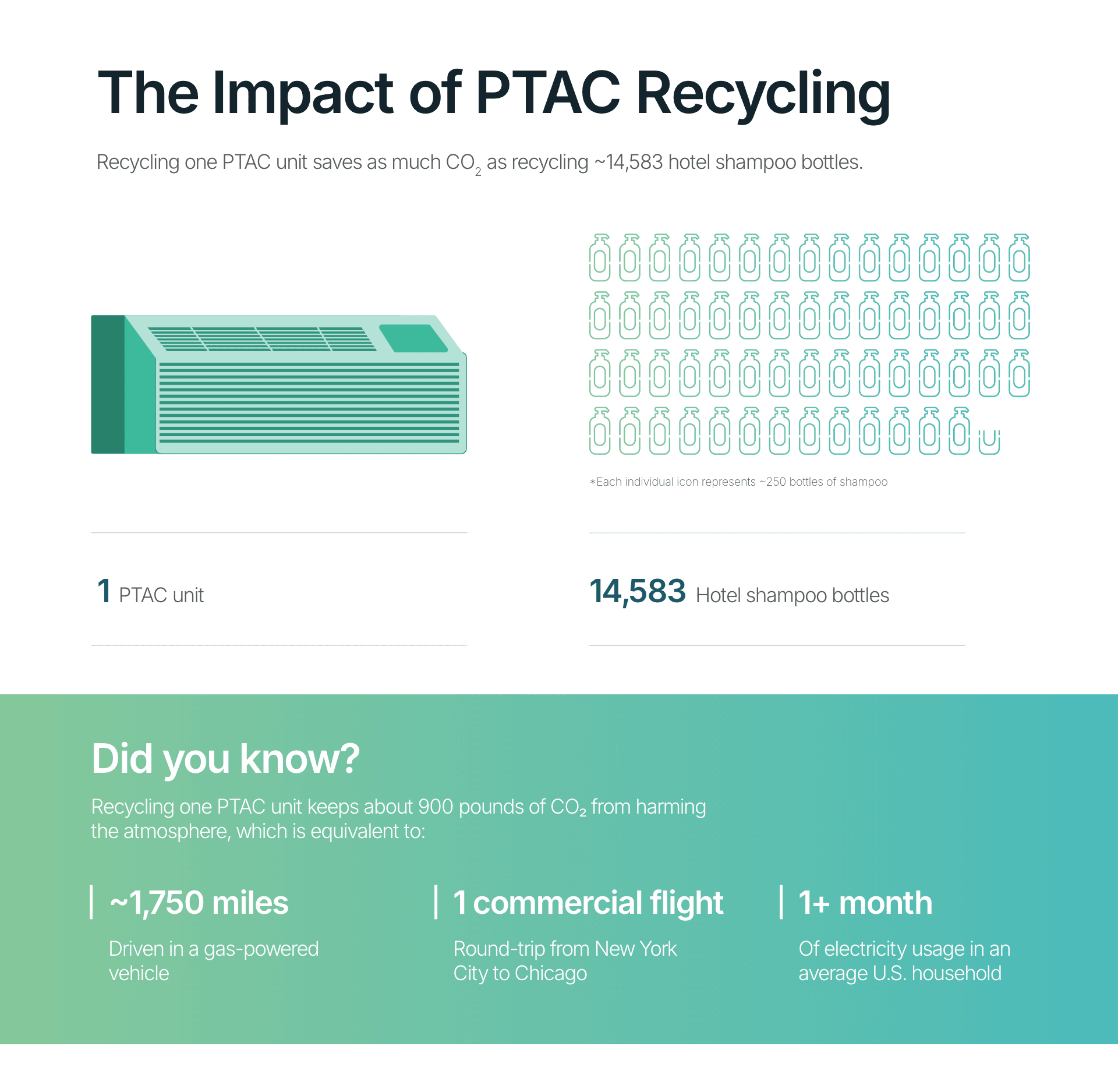 For RoomOne Solutions, I designed a homepage section that illustrated the environmental impact of properly recycling PTAC units. The visual used shampoo bottles as a relatable reference point to demonstrate how many bottles worth of plastic are saved when recycling just one PTAC unit, making the sustainability message both tangible and compelling.